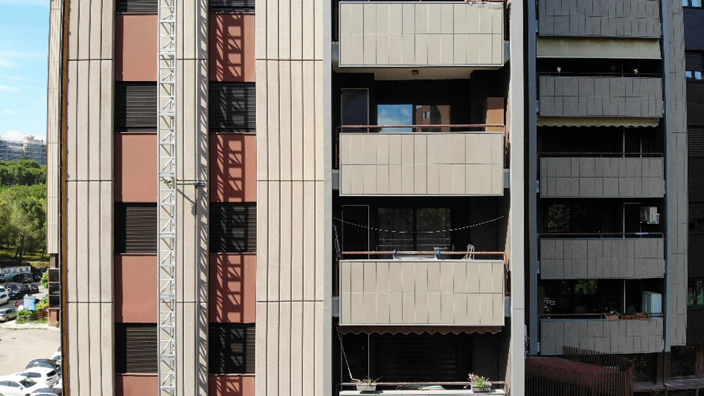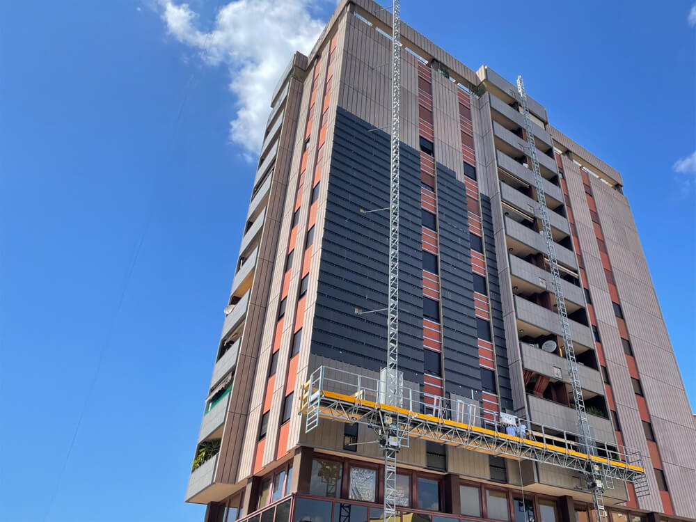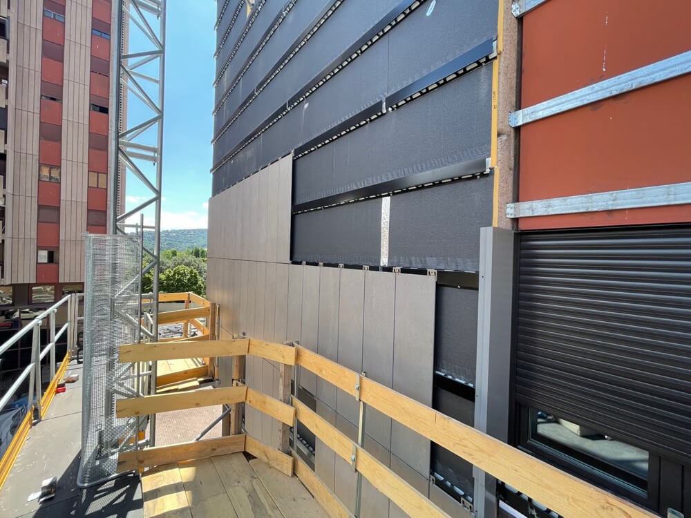 Data la ragguardevole altezza degli edifici di 12 piani, i progettisti hanno optato per il Sistema Isotec Parete Black, dalle migliorate prestazioni di reazione al fuoco (classe B-s2, d0). Il pannello è stato fissato a secco mediante tasselli in acciaio zincato al supporto esistente rivestito in intonaco e clinker. Ai correntini metallici di Isotec Parete Black sono state poi ancorate con ganci a vista le doghe in grès ceramico, scelte nel formato 30×120 cm e montate in verticale, a ricreare l’aspetto a correre del rivestimento precedente. La regolarità della geometria delle ampie superfici continue e la facilità di posa di Isotec Parete hanno permesso di contenere i tempi di realizzazione della facciata ventilata e di razionalizzare le operazioni di cantiere. Una particolarità dell’esecuzione è stata l’assenza dei ponteggi: la posa delle facciate è infatti avvenuta mediante ponteggio mobile, agevolata dalla leggerezza dei pannelli e dalla loro maneggevolezza in quota.