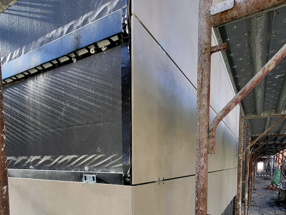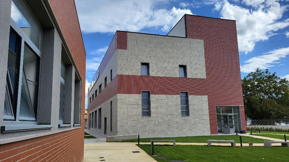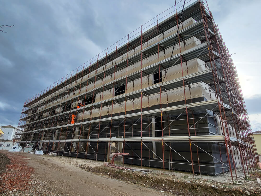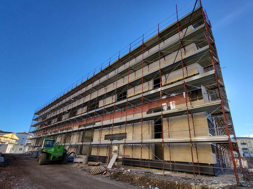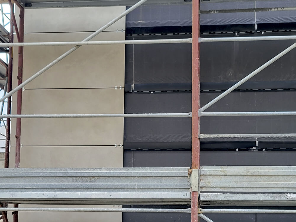 Il nuovo immobile è realizzato con un mix di tre tipologie costruttive: il cemento armato precompresso, una struttura in carpenteria metallica e una parte in cemento armato gettato in opera; il tamponamento esterno è in laterizio intonacato. Trattandosi di una demo-ricostruzione, non era vincolante l’ottenimento di prestazioni NZeB, ma i progettisti hanno comunque mirato a perseguire un elevato grado di efficienza energetica, unitamente a ottime prestazioni di reazione a fuoco, in virtù della natura pubblica dell’edificio. Per ottenere questi obiettivi, il progettista ha selezionato la soluzione della facciata ventilata con Isotec Parete Black, la cui posa ha impiegato una squadra di 4 persone da gennaio ad aprile per 1.600 mq circa di superficie verticale. Particolare attenzione è stata prestata alla preparazione cantieristica, grazie anche all’assistenza tecnica prestata dal funzionario di Brianza Plastica che, mediante consulenze mirate in cantiere, ha fornito supporto alle maestranze nel corso delle lavorazioni. Al Sistema Isotec Parete Black è stato abbinato un rivestimento in grès in due diversi formati: 60×120 cm in colore beige e 20×60 cm color cotto.