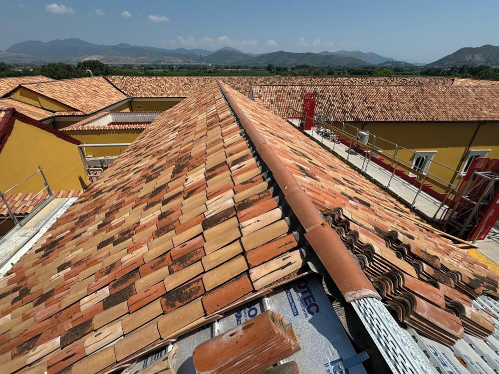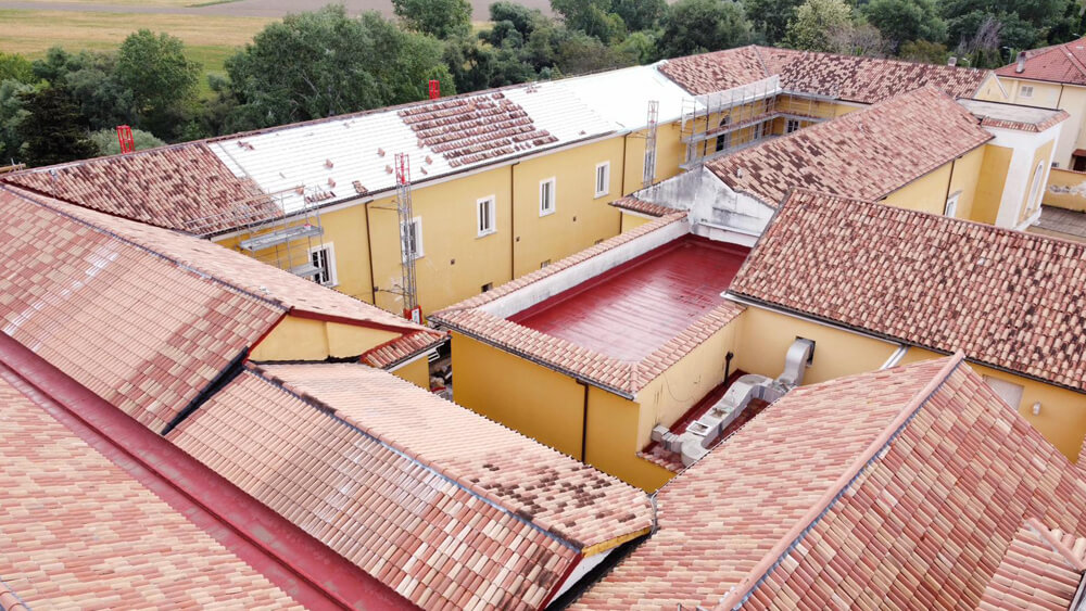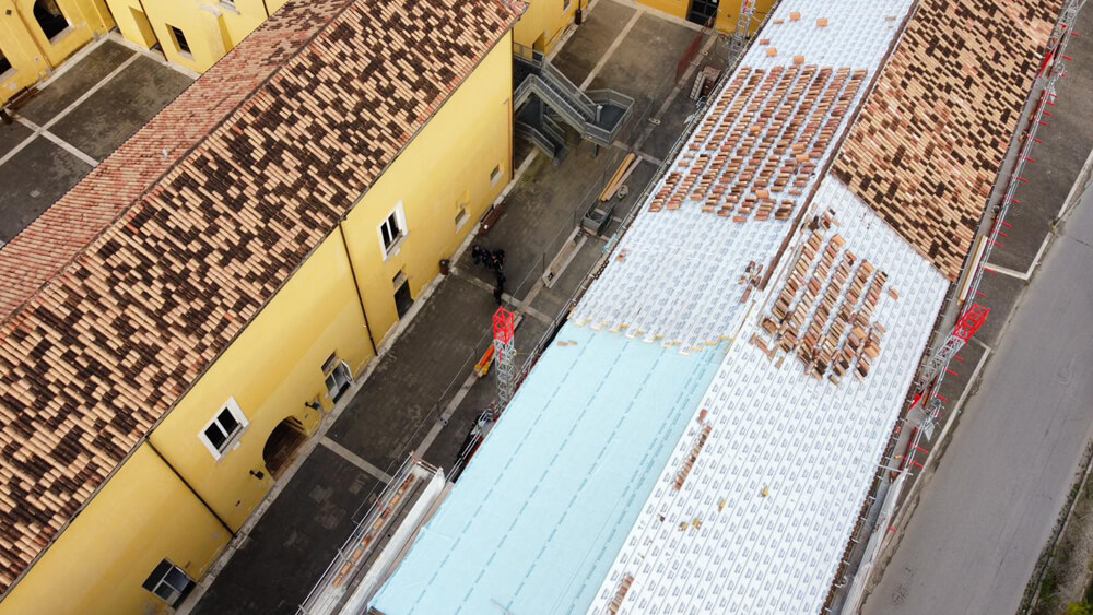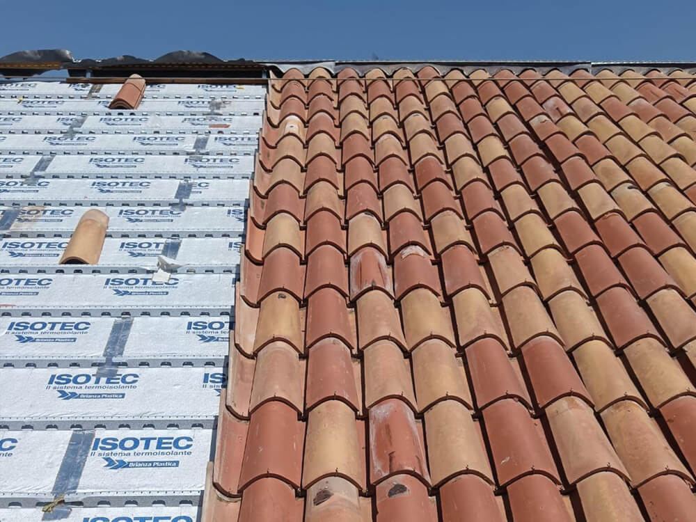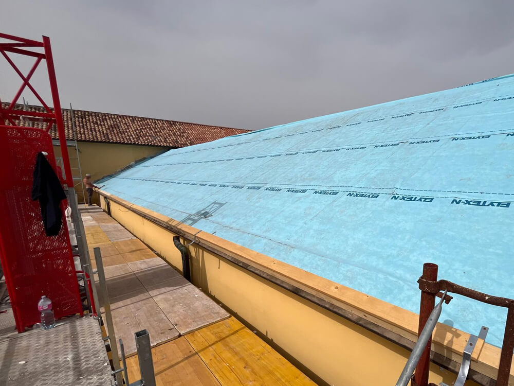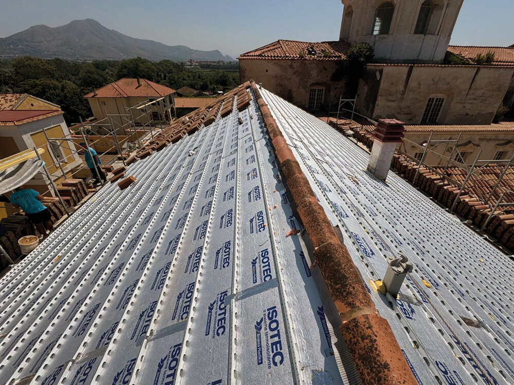 L’estesa copertura a doppia falda, con la sua superficie di 5.200 m2, visibilmente e pesantemente ammalorata, è stata completamente smantellata, recuperando e accantonando i coppi in buone condizioni per la successiva posa. Sono state poi rimosse e smaltite le deteriorate lastre sottostanti, pulito e regolarizzato il supporto. Successivamente è stato steso sul supporto il telo impermeabile e traspirante Elytex-N e, a seguire, sono stati posati i pannelli Isotec, dimensionati nello spessore di 120 mm e con passo di 360 mm, per adeguarsi alla dimensione dei coppi.