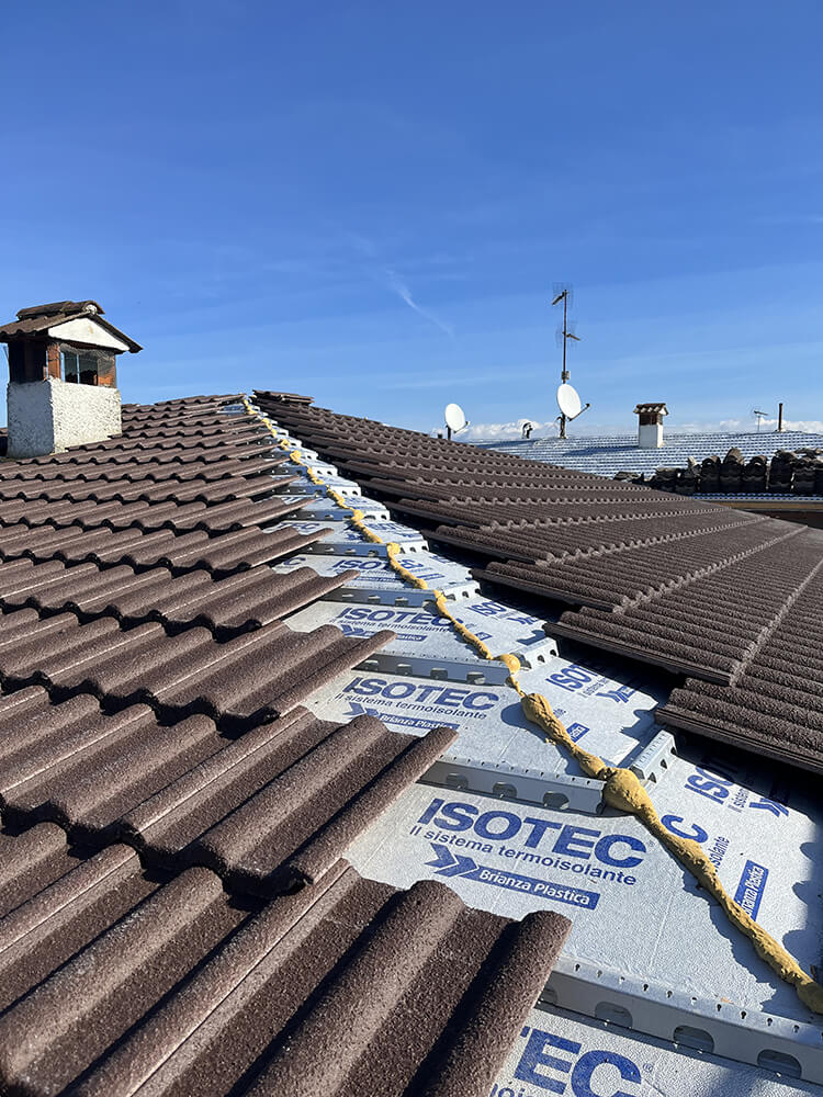 L’intervento di ristrutturazione ha preso avvio dalla rimozione delle tegole esistenti, fino alla ripulitura della superficie di appoggio. Quindi, si è proceduto alla regolarizzazione della superficie di posa dei tavelloni nudi con malta cementizia, ove necessario, e successiva stesura della guaina impermeabilizzante. I pannelli Isotec sono stati poi fissati mediante tasselli in corrispondenza delle fughe, senza forare i tavelloni.