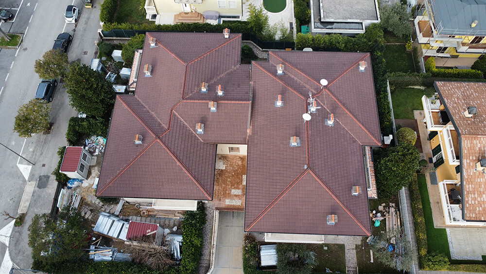 I numerosi punti di discontinuità del tetto, composto da molte falde con diversi compluvi e displuvi, oltre a numerosi corpi emergenti (comignoli), sono stati trattati dall’impresa con gli accorgimenti di posa consigliati dal produttore e gli accessori studiati per il completamento del sistema.
