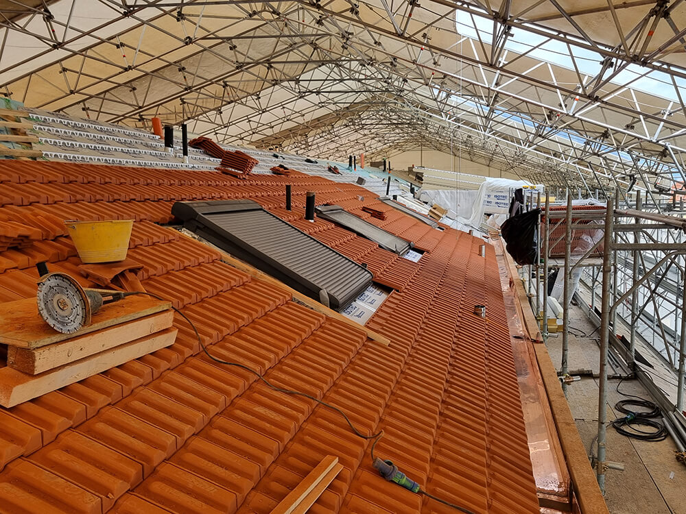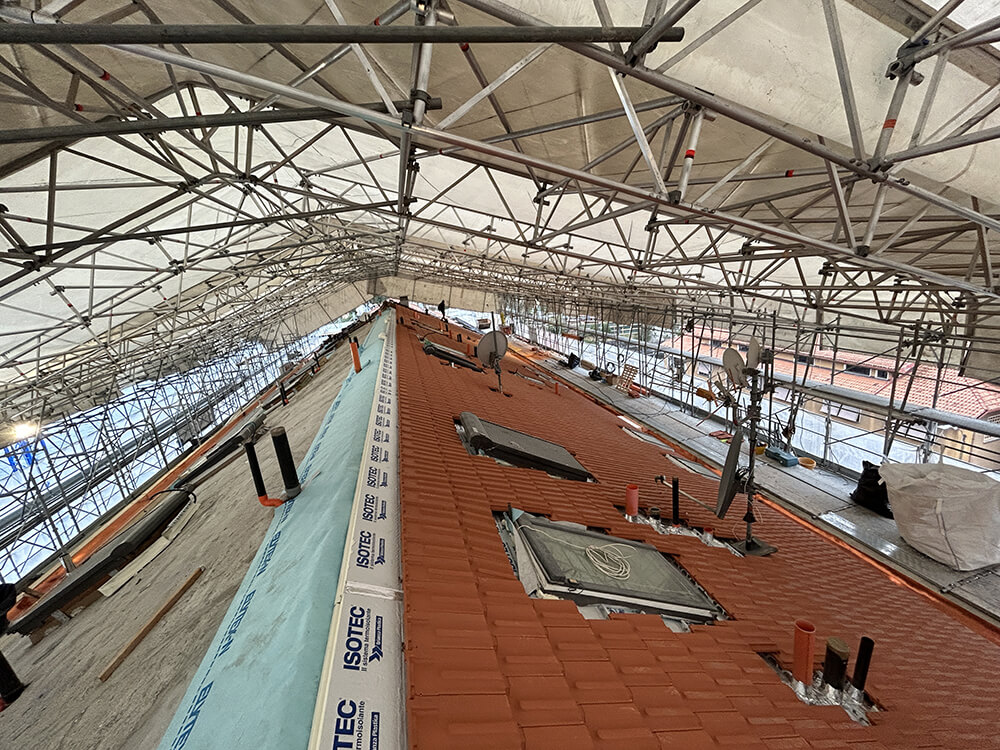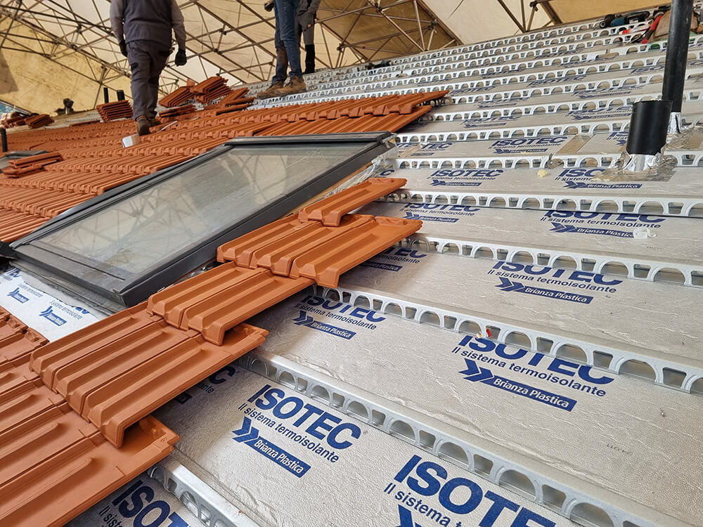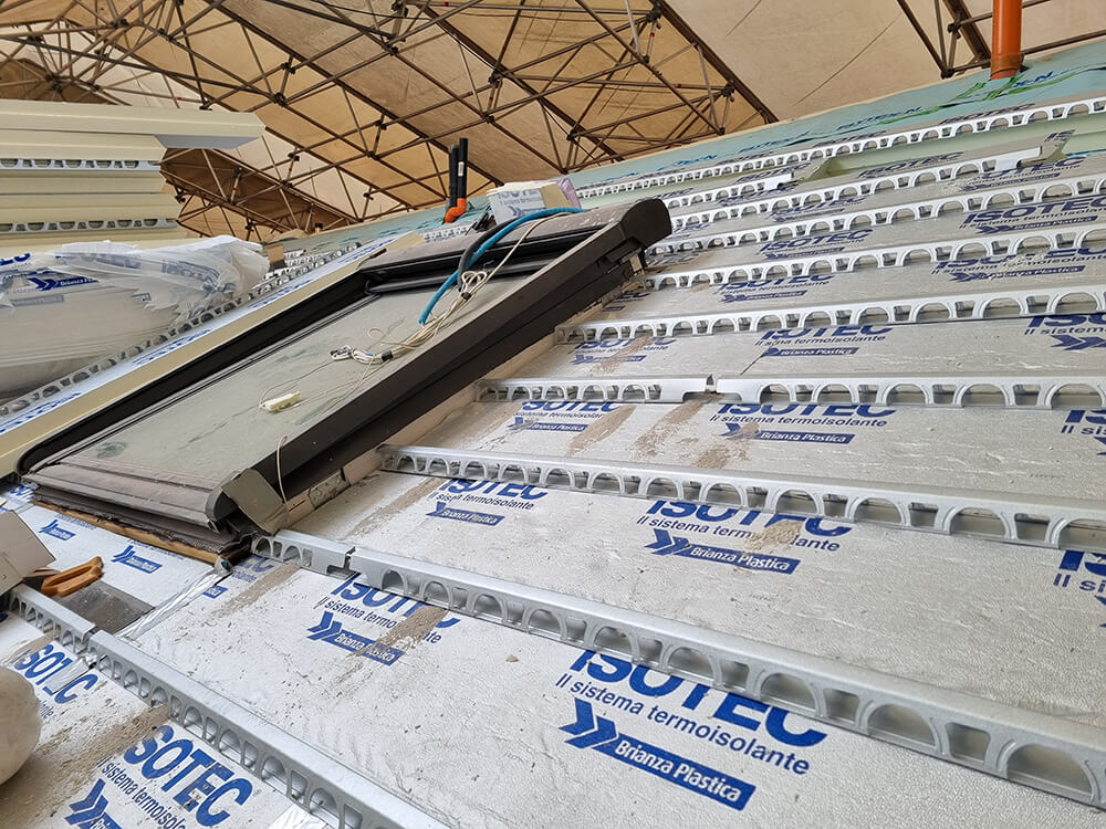 L’intervento sulla copertura ha preso avvio rimuovendo il vecchio manto di tegole ammalorate, procedendo a ripulire e rendere omogenea la soletta. La grande copertura presenta una struttura portante in metallo con tavelloni e caldana gettata in opera a costruire un solaio leggero. Una volta reso omogeneo il sottofondo, è stato steso il telo traspirante Elytex-N di Brianza Plastica, su cui sono stati poi posati i pannelli termoisolanti Isotec XL, scelti nello spessore 120 mm e nel passo 320 mm, adeguato a supportare le tegole marsigliesi di lunghezza corrispondente.