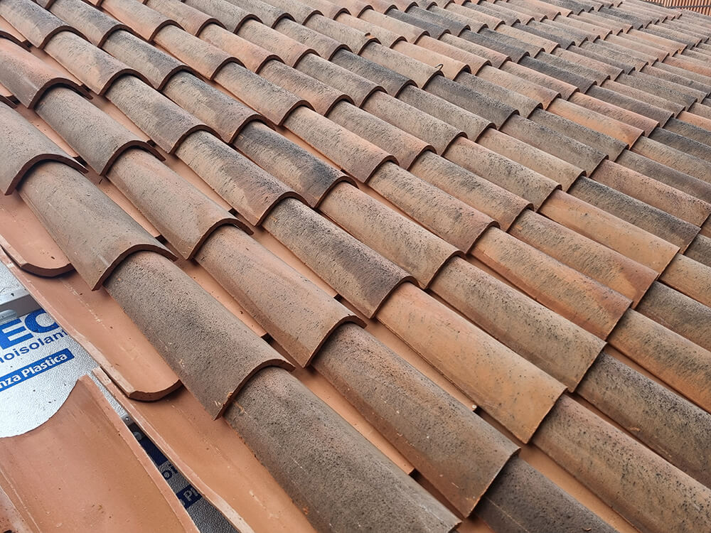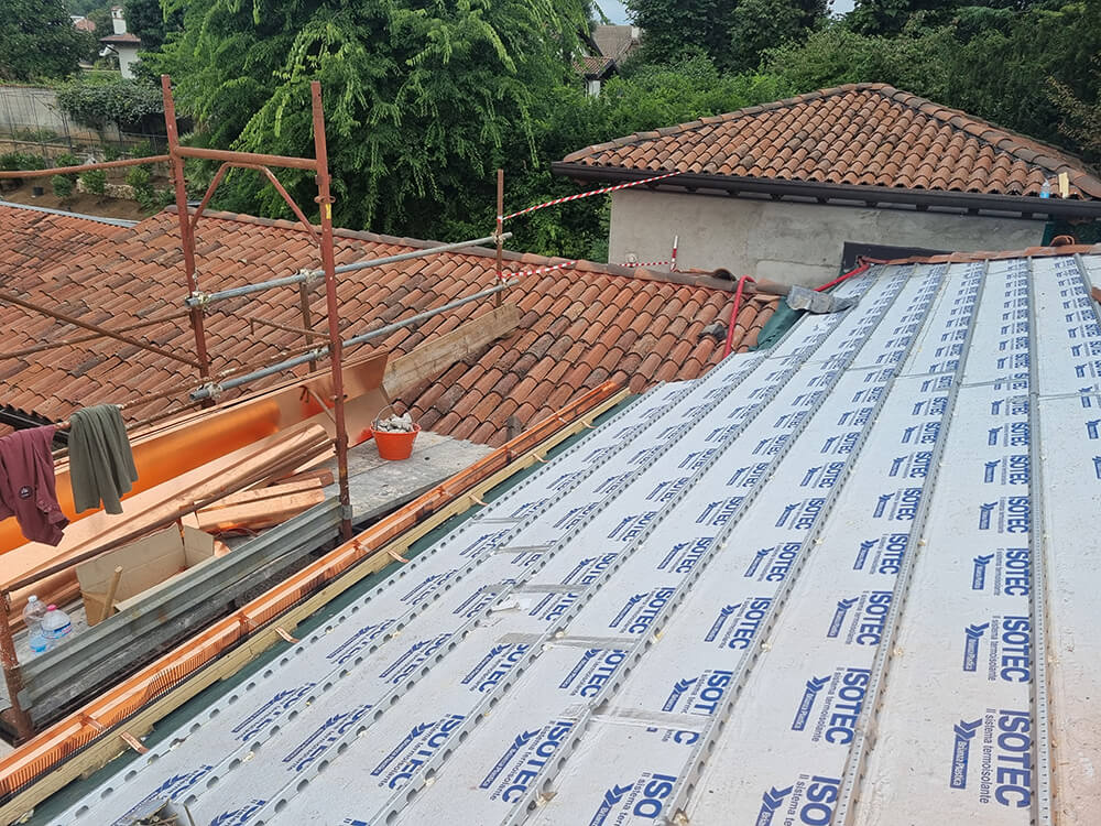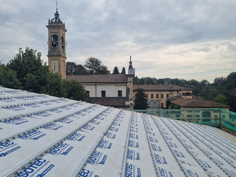 Il recente intervento di ristrutturazione ha riguardato la copertura dell’edificio, con l’obiettivo di risanare le parti ammalorate e migliorarne l’efficienza energetica, senza alterarne l’estetica storica. L’intervento è iniziato con la rimozione del manto di copertura esistente, seguito da un’attenta verifica dello stato del supporto ligneo sottostante; successivamente, è stato applicato un telo barriera al vapore. Si è quindi passati alla posa dei pannelli Isotec, procedendo dalla gronda verso il colmo, per file successive e a giunti sfalsati. I pannelli sono stati posati avendo cura di accostare perfettamente i bordi, fissati al supporto ligneo tramite idonei tasselli, offrendo continuità dell’isolamento termico e performance di seconda impermeabilizzazione. Sui correntini metallici di Isotec sono stati poi disposti i bicoppi di canale con dentello e la copertura completata con l’installazione di coppi anticati, preservando il fascino architettonico originale dell’edificio.